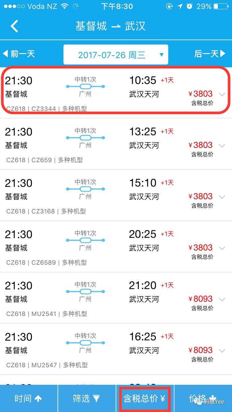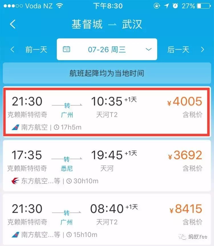 比如,我随便在携程上搜一下2017年7月26日基督城飞武汉(好想回家过夏天~~),考虑到飞行时间、转机时长、价格等等因素,携程整合计算后优先推荐了南方航空21:30-10:35(+1)的这趟航班,含税总价¥4005。