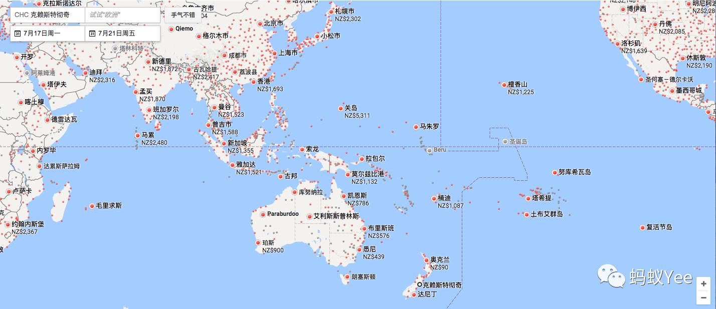 Google Flight可以搜到从已选的出发地到世界各地的价格,并将他们整理显示在地图上,一目了然(国内要翻墙);