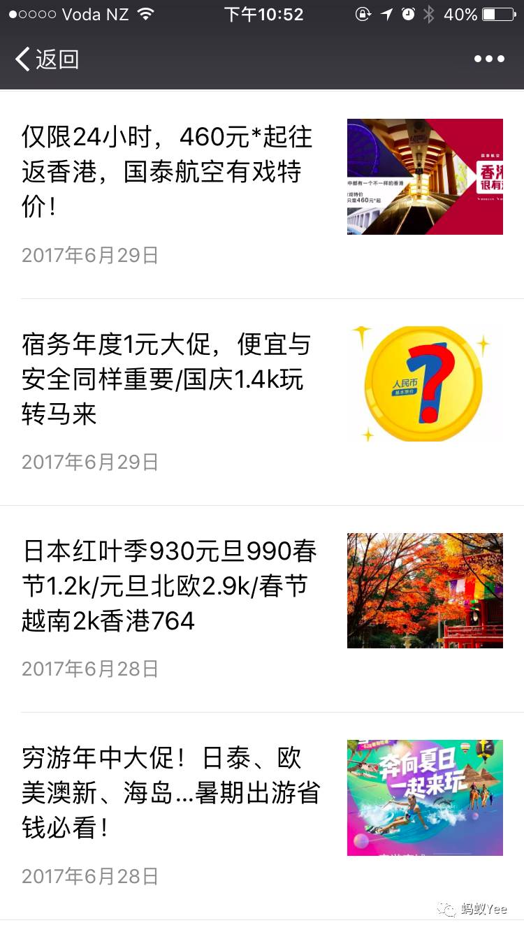 这是我个人觉得非常不错的一个公众号,特价信息发布及时、内容全面详细,而且很少广告。光看这每一篇文章的标题,我觉得不出门耍都对不起这特价。