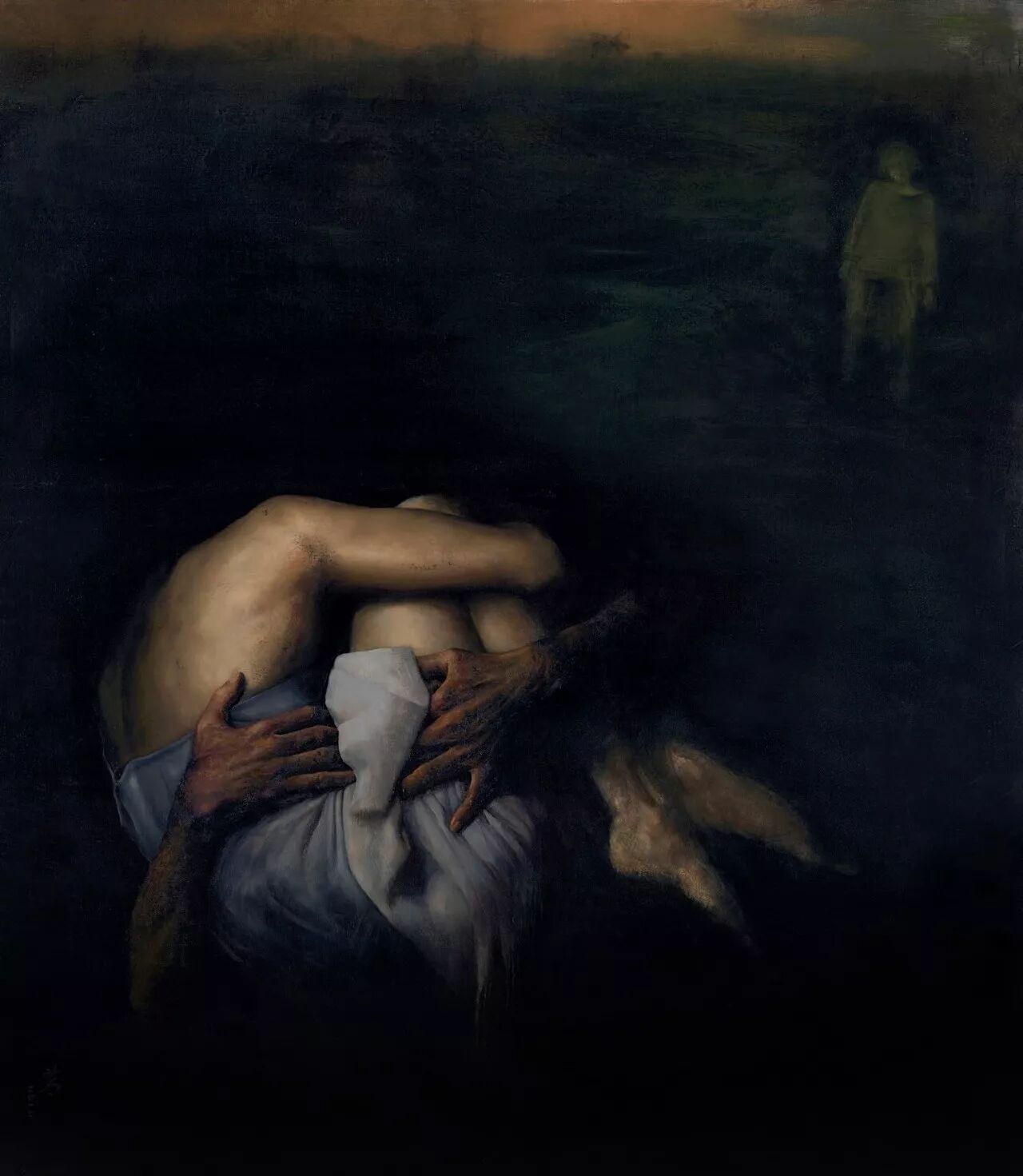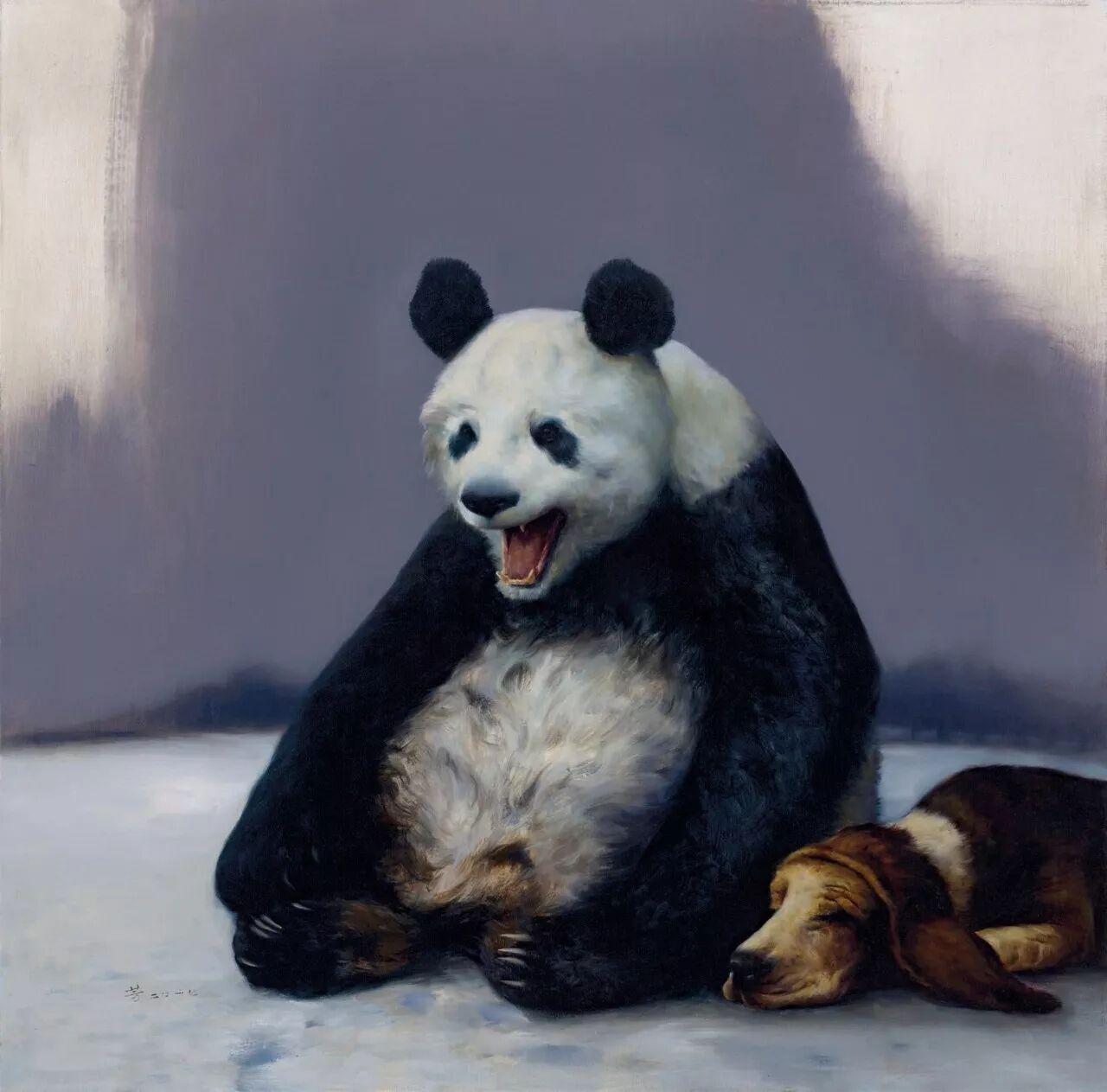 罗芳的画作,在平静的具象表达中,透溢出一种犀利、一种深刻,他总是用画笔表出对有媒体构建的“景观社会”的警觉、反思与批判。他的《墙上的画作》、《红衣少女》等作品,无疑蕴含着他对艺术界炫耀式浮华的否喻,而他的《铜板交响曲》、《对话》、《无名碑前的救赎》含蓄而犀利地表达了对人在自己的制造物面前被异化的批判态度。艺术也好、金钱也好,疑惑道德训诫、体制构建也好,本身是人的创作物,也是为人而存在的,但是当人成为这些东西的奴仆之时,人性必然被挤压,罗芳试图以视觉的语言,抵制人的异化,呼唤人性的回归。在他的《欲望》、《美女与狼》、《一皆为艺术》等画作里,我们感受到是感性欲望、平庸的快乐对人的本真的消解与遮蔽。人在“现代性”的追求中,人与自然的关系被分解,自然在遭遇人的粗暴践踏的同时,自身也被割裂成无数的碎片,完整的人不复存在,人的欲望像潘多拉魔盒,一旦开启,被挤压与窒息的是人自身,这是在罗芳的《惊弓之鸟》、《错位》、《遗忘的世界》等作品传递出来深刻的忧患与反省意识。正如他所说“我以悲怆的方式描述世界,并不是想赚取大家的眼泪,只盼着人们可以感受到自己身上的幸福,或许有些残缺,甚至怜悯的只有一点点儿。…我把存在的丑态摆在世人面前,但并不代表整个世界都是丑陋的。对于画面故事里的人或物貌似有些不尽情意,其实是出于一种对客观的同情却尽可能的保持了温和,同时对我们唯一生存的未来也充满了希望和憧憬。”与其说罗芳是一个悲观主义者,还不如说他是一个乐观的悲观主义者,或者说他是一个理想主义者。在他眼里,在日常的平静中,总是充斥着延异的景象,在人们习以为常的状态中,世界总是危机四伏。这种反思与批判的精神,恰恰正是他“对我们唯一生存的未来也充满了希望和憧憬”愿望的体现。从这一点来说,罗芳的艺术很具当代精神。他是一个行走在艺术原野上的沉思者,一个在画布上彰显人文关怀的艺术家。