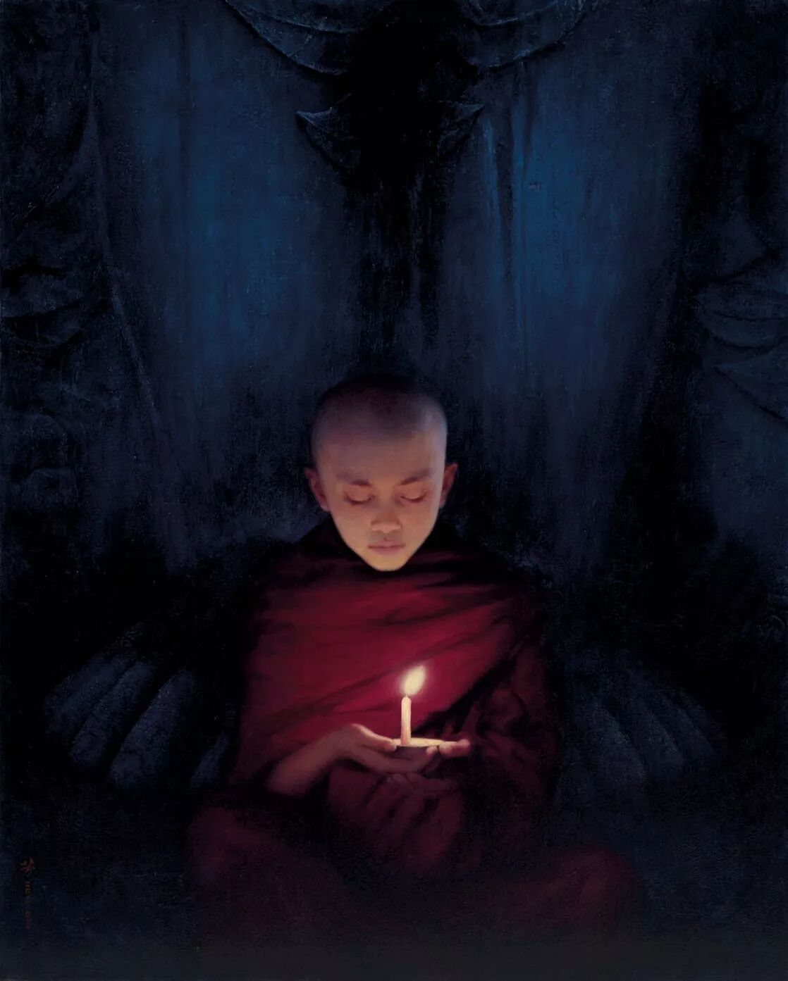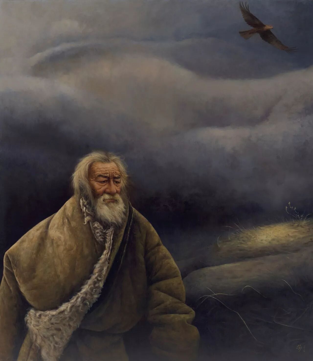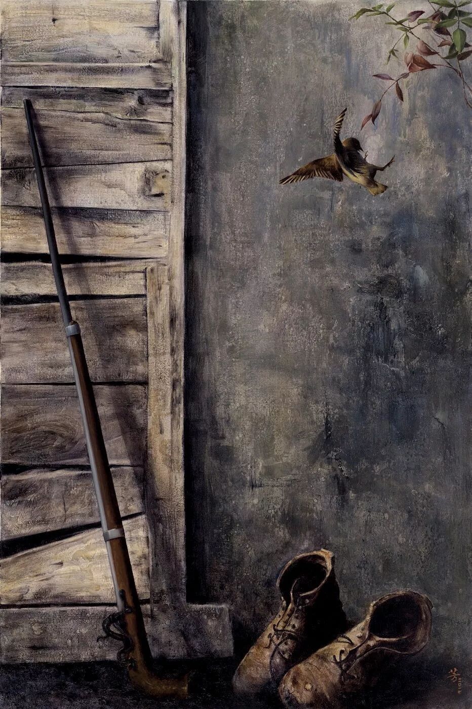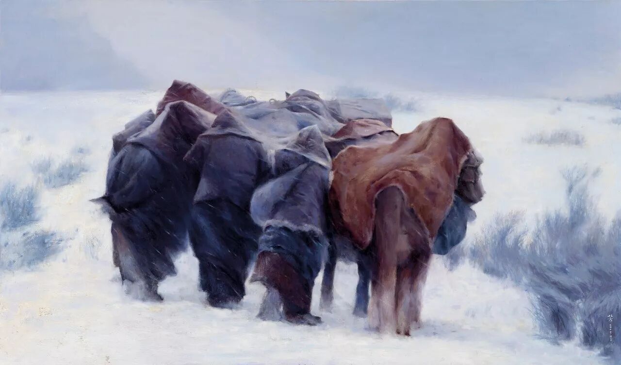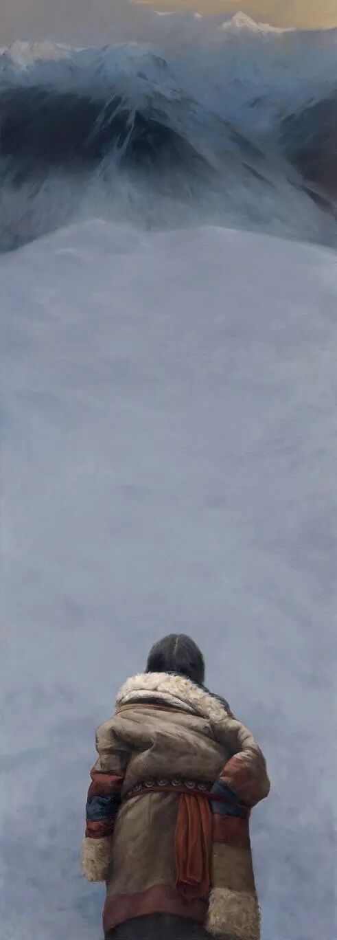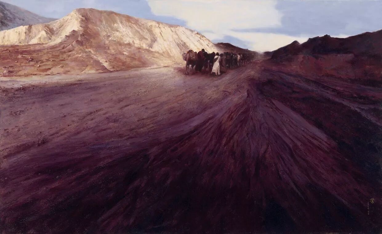 罗芳写实性、或者具象语言构建的画作中,很少有与经验中的现实表象对应的景象,而更多的是心灵的镜像,折射出他对生命的价值与意义的追问与思考、对时空悠悠浩瀚无垠的感概。在他的《老屋》、《宿命》、《岁月里没有足迹》等作品里,让人感受到是生命在永恒时光中的短暂与脆弱,在天地悠悠中的渺小与孤寂。作为时空的存在物,任何个体的生命,无论有着何种的抱负与梦想,有着什么的样荣耀与辉煌或者有着怎样的坎坷与遭遇,都不过是如戏一般短暂而虚幻,一切都将灰飞烟灭,成为无踪无迹的过往,留下的只是镌刻着岁月侵蚀的斑斑痕迹。凝视他的作品,我们不由得会想起“前不见古人,后不见来者,念天地之悠悠,独苍然而滴下”的千古嗟叹。在罗芳的画作和心灵中,弥漫着浓浓的宿命的悲切意识。这种意识的生发,不是绝望所致,而恰恰是人的自觉意识复苏的体现。只有具有生命自觉意识的人,才会有“人生苦短”、“人生如梦”的悲苍叹息,没有这种意识的复苏,便只有在物欲中醉生梦死,在浅薄的快乐中游戏人生。人总是在时空的限定中快速地走完生命的里程的,现实的一切都将成为空漠的原野,或者最多成为来者的追忆。那么,有无我们灵魂栖息的彼岸?有无安放心灵的家园,罗芳无疑在他的画作中持续地寻找着答案,不,应该说,他在用艺术这种特殊的也是虚幻的方式,构筑着他的家园,追逐着他的彼岸,于是我们在他的《眺望》、《一路向西》、《朝圣之路》、《打扰》、《静思》、《心语》等作品中,感受到一种强烈的超越的愿望,一种常人难以掂量的幂幂之中的超度的力量。这些作品,不是作为凡人的艺术家对宗教题材的猎奇心态的表现,而是他以艺术的方式,将宿命的意识转换为一种对“当下”的疏离,对精神永恒性的自觉追求。梁启超在谈到艺术之于人的意义与价值时,曾说艺术的最高境界就在于使人在“他界之暝构与慕进”中感受人生的趣味。罗芳一直在追逐他心中的“他界”,他的“他界”绝不在世俗的景观中,而在他的心灵中,在他的艺术里。初看罗芳的画作,或许会感受到一种宿命的色彩与悲观的情调,但是在凝视中,会体悟到一种大彻大悟的冷静,一种对于永恒的乐观的期待,心存“他界”者,何有真正的悲凉与绝望呢!只有心无彼岸者,才会以世俗感性欲望肆意彰显遮蔽不问明日的悲哀。所以罗芳的艺术作品是对市井图像的疏离,是一种延异了世俗表象的景观。