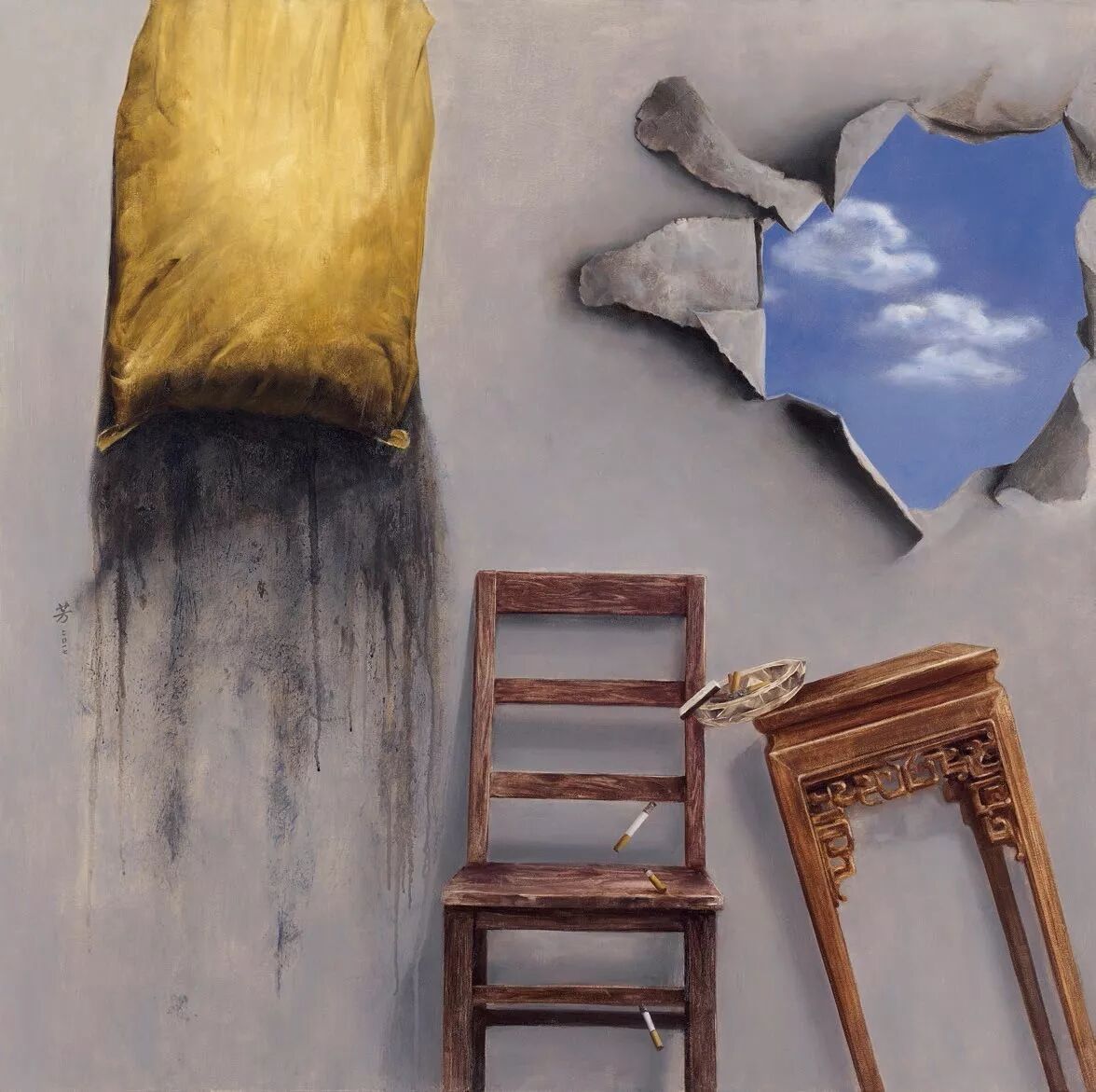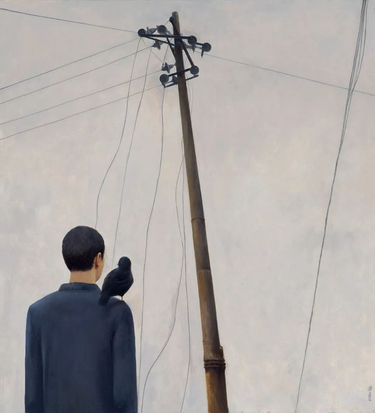 罗芳是带着对世俗景观的疑惑与反思回归到艺术天地的,是体会了市井的喧哗而进入安静状态的,所以,反思与批判,沉思与超越必然成为他一种生存与生活的状态,成为他在画布上诗性化言说的题材与内容。言说内容的形而上意义与他言说的冷敛语汇并重,蕴含着他历经浮华喧嚣的世态、打量世俗景观后的悲天悯人的情怀,折射出他对人生终极意义的追问与思考。