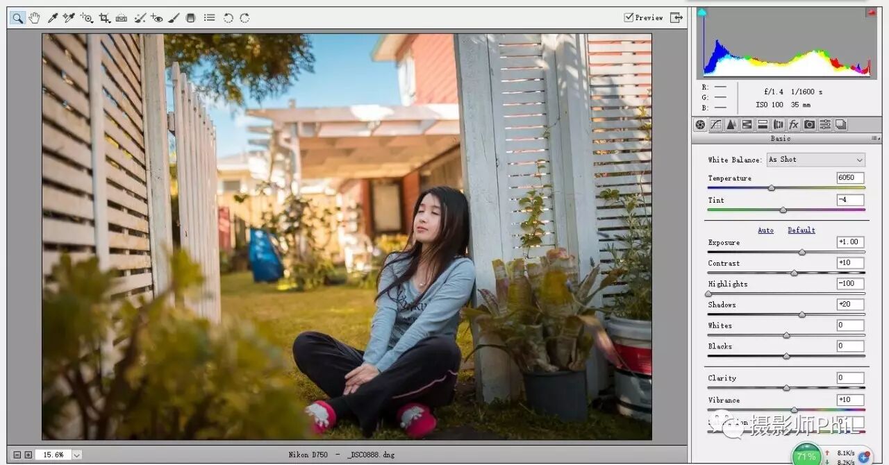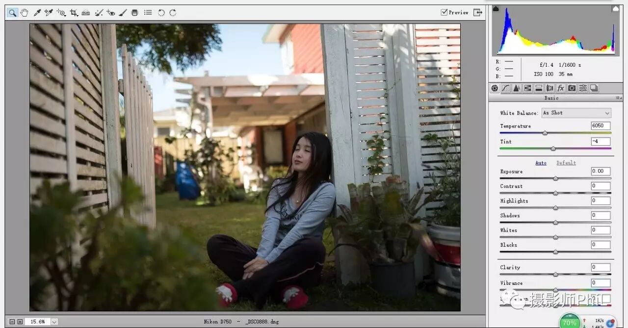我先讲解一张去年在我徒弟家后院给她随拍的片子,这是raw格式导入camera raw的原片