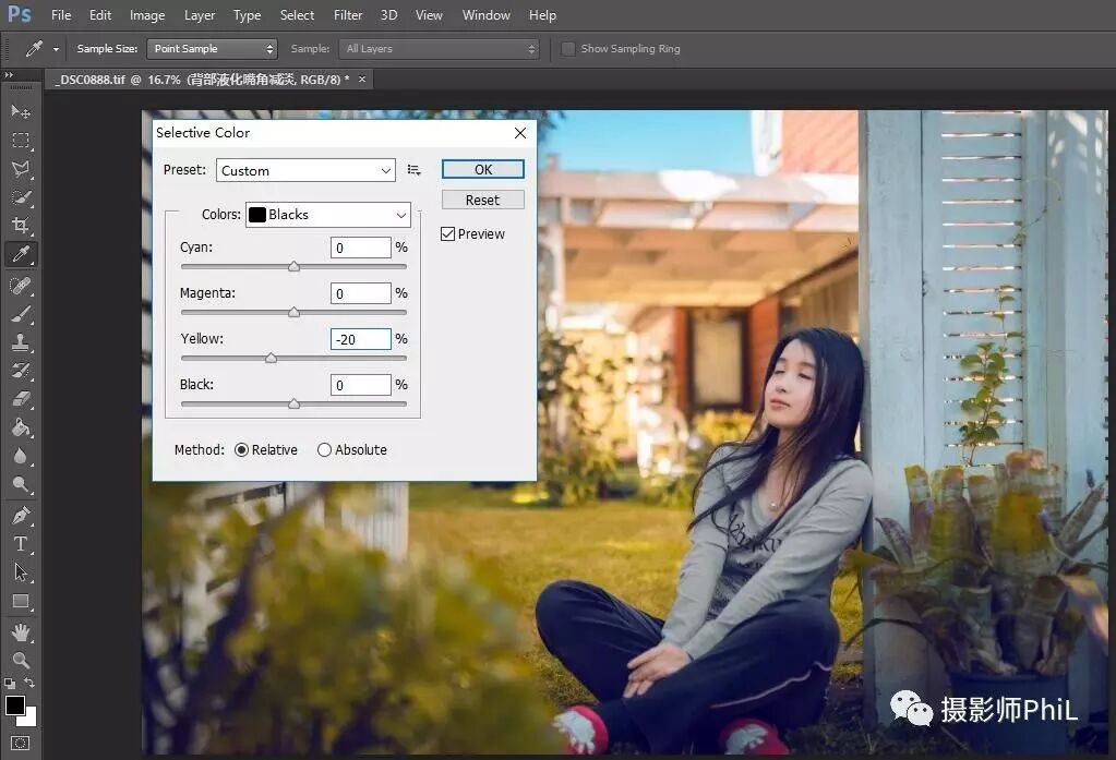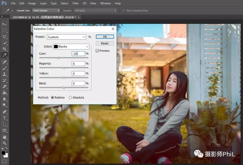 而通过调整可选颜色当中黑色的部分,可以改变照片的风格,比如这样
