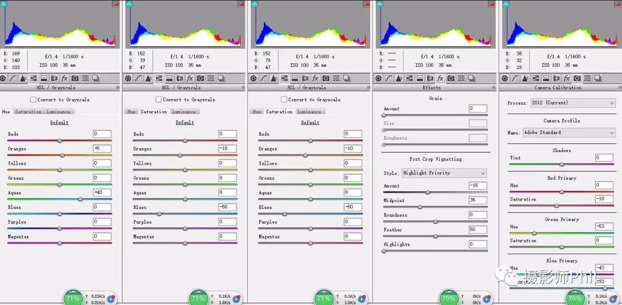在camera raw里进行基本调整,如曝光,对比,高光,暗部,清晰度,饱和度以及每种颜色的色相,饱和度及明度处理。单以这张照片来说,大致的调整思路是让画面看起来更暖