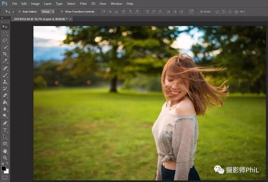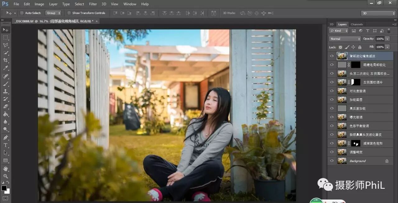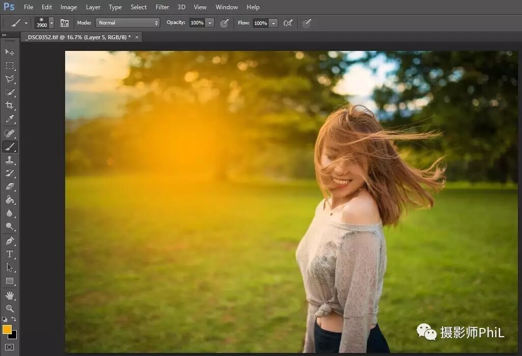 接下来再说一张上篇公众号里的片子,有小伙伴留言问我逆光效果怎么修。逆光效果的先决条件是需要拍摄时真的处于逆光,能拍出人物轮廓光更好,如果不是逆光而强行加上逆光效果只会让画面看上去很假。而修逆光最简单的做法是直接购买或下载逆光插件,如果没有的话可以用笔刷自己画。