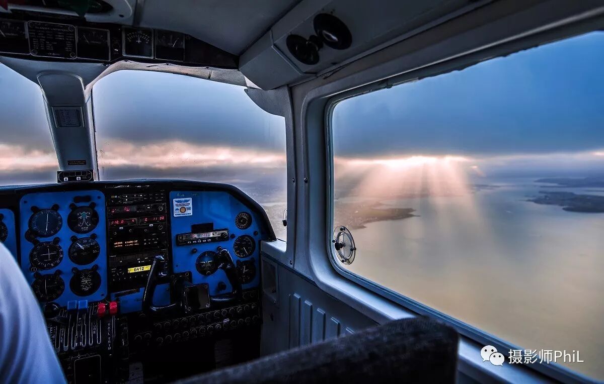 摄于从Great Barrier Island回奥村的飞机上。第一次去大屏障岛,不仅是我,还有其他许多来了很久的人都没听说过这个人口只有900的小岛。岛小也就算了,就连往返的飞机也很迷你,只有八个座位,而且就像画面中这样,驾驶舱近在眼前。我们去的时候坐在后排,回来Check in的时候我问柜台是否能给我第二排的票,于是便有幸参观到了驾驶舱。飞机快到奥村的时候天色已近黄昏,我看看窗外发现太阳被厚厚的云层遮住,只有几缕阳光穿透云层洒了出来,于是便拍下了这张和一般机舱视角不太一样的照片。
