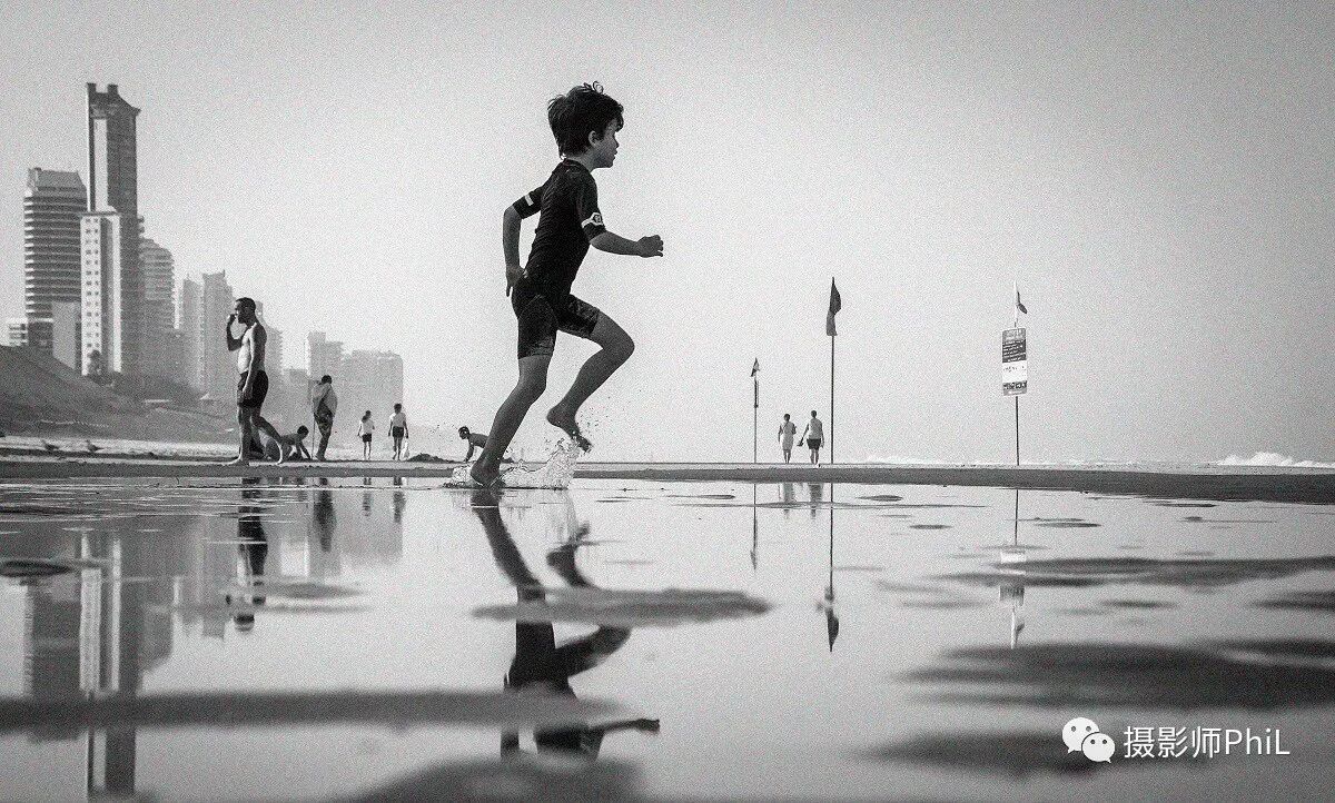 摄于Gold Coast Surfers Paradise。不得不说,黄金海岸的海岸线可真够长,其中最著名的就是这个“冲浪者天堂”了,赶上天好的时候一眼望去跟国内的海滨浴场没差。这天我独自一人在溜达,走着走着,没错,就看到了这有一小滩海水,然后老规矩打开翻转屏,蹲下来构图。我当时的想法是拍一张倒影,最好画面中能穿插两三个人这样子,等了一会拍了几个行人后,突然这个孩子毫无征兆的从画面左边跑了进来,我没多想立即按下快门,很幸运的抓到了这个决定性瞬间