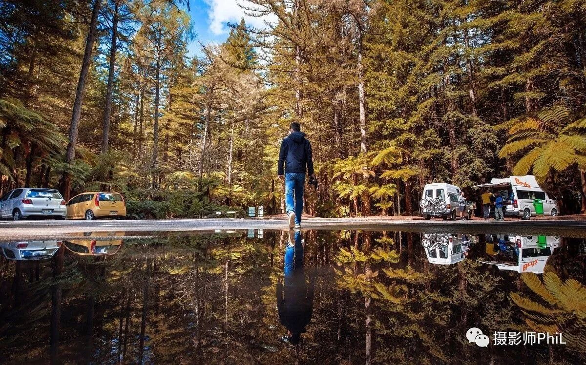 摄于Rotorua Redwood。跟两个徒弟的一次说走就走的周末旅行。泡了温泉,然后去红木森林和地热公园溜达一圈。这是在红木森林的停车场拍的,前一晚的雨水在地上留下一小滩积水,我一看到这种场景就兴奋,立马让二徒弟在前面“没病走两步”