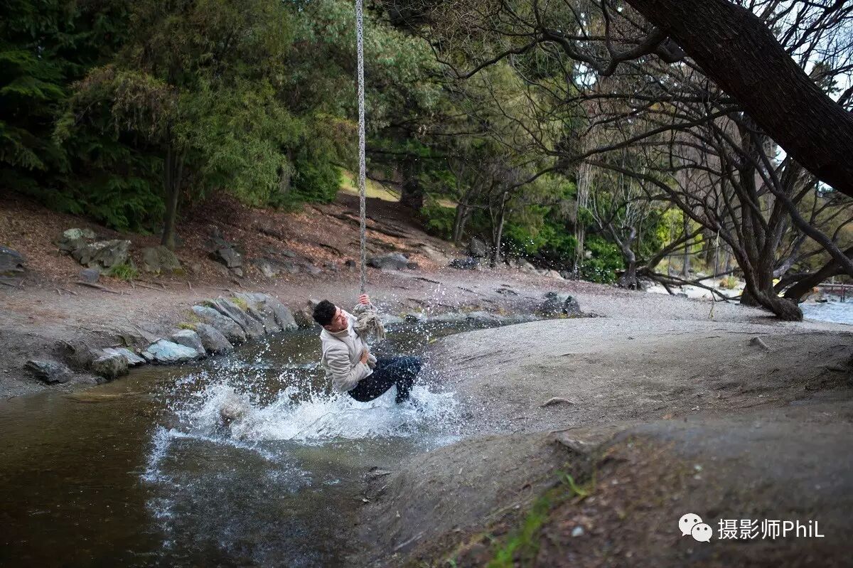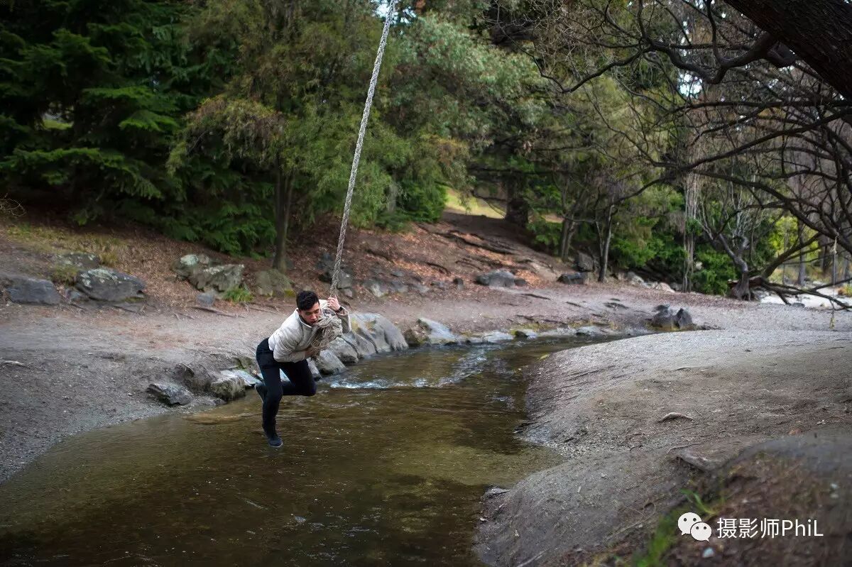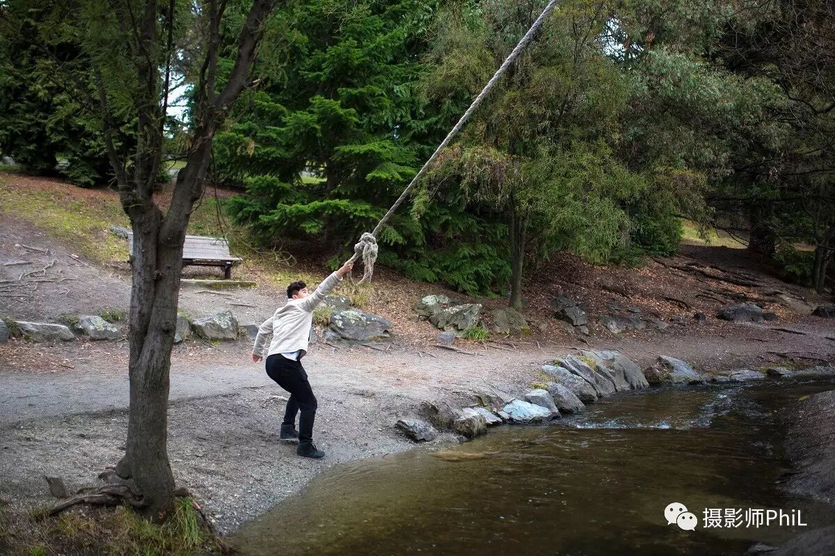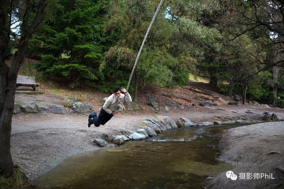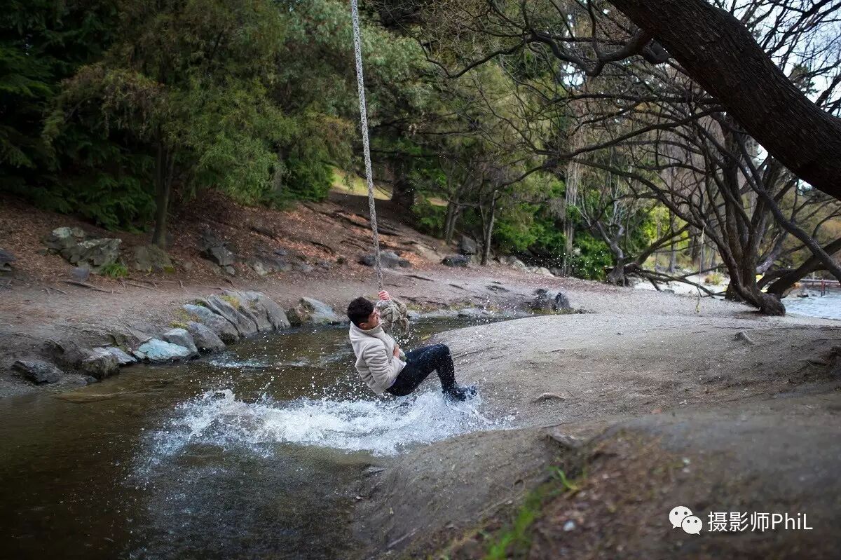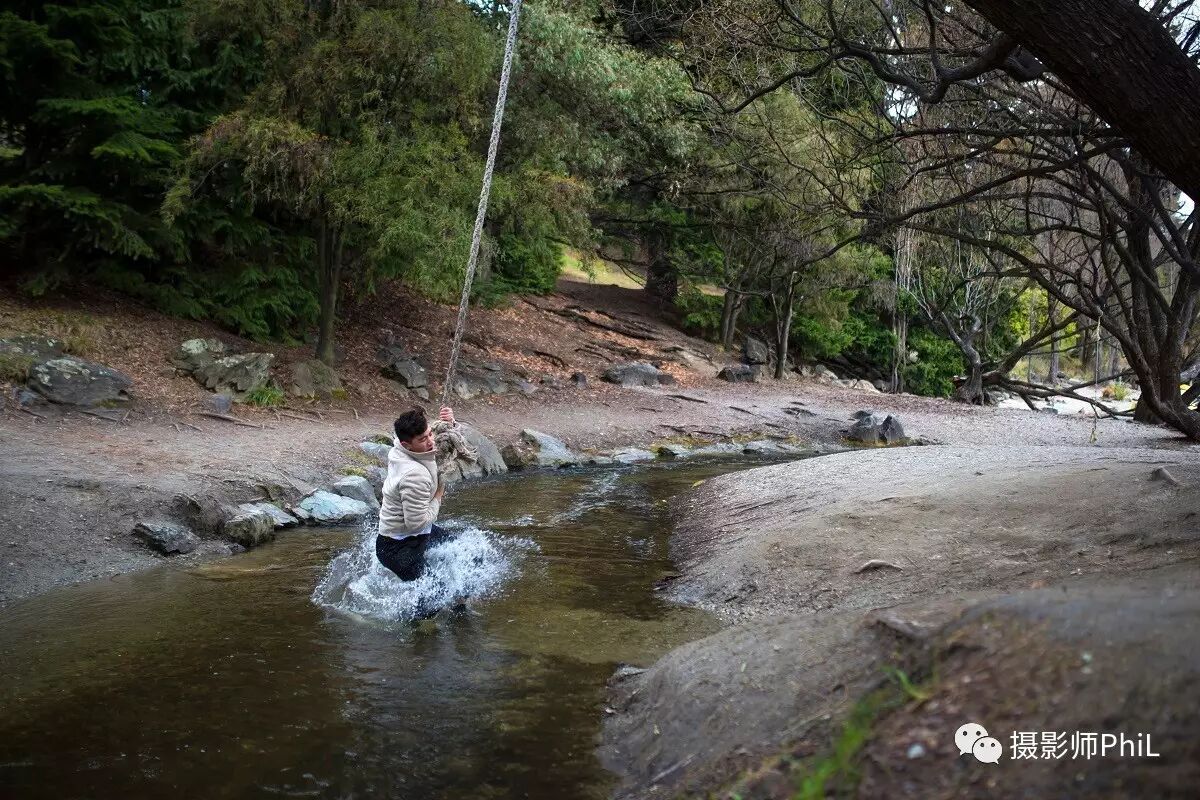 皇后镇的一侧有一条非常窄的小溪,树上不知从何年何日起被一位高人栓了根粗绳供游人荡着玩。但这里有一个陷阱,就是两边的地势差。从右往左荡很容易,但从左往右百分之百会进水,别问我怎么知道的,只能说我是过来人。。。Will自然不知其中奥秘,因此当他从右边荡到左边然后打算再荡回去的时候,我笑而不语,默默的端起手中的相机,按下了这组连拍。请叫我心机Boy。
