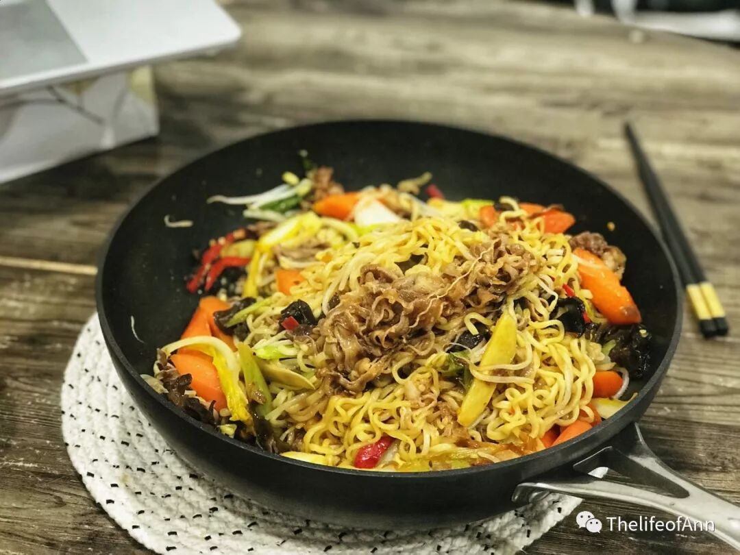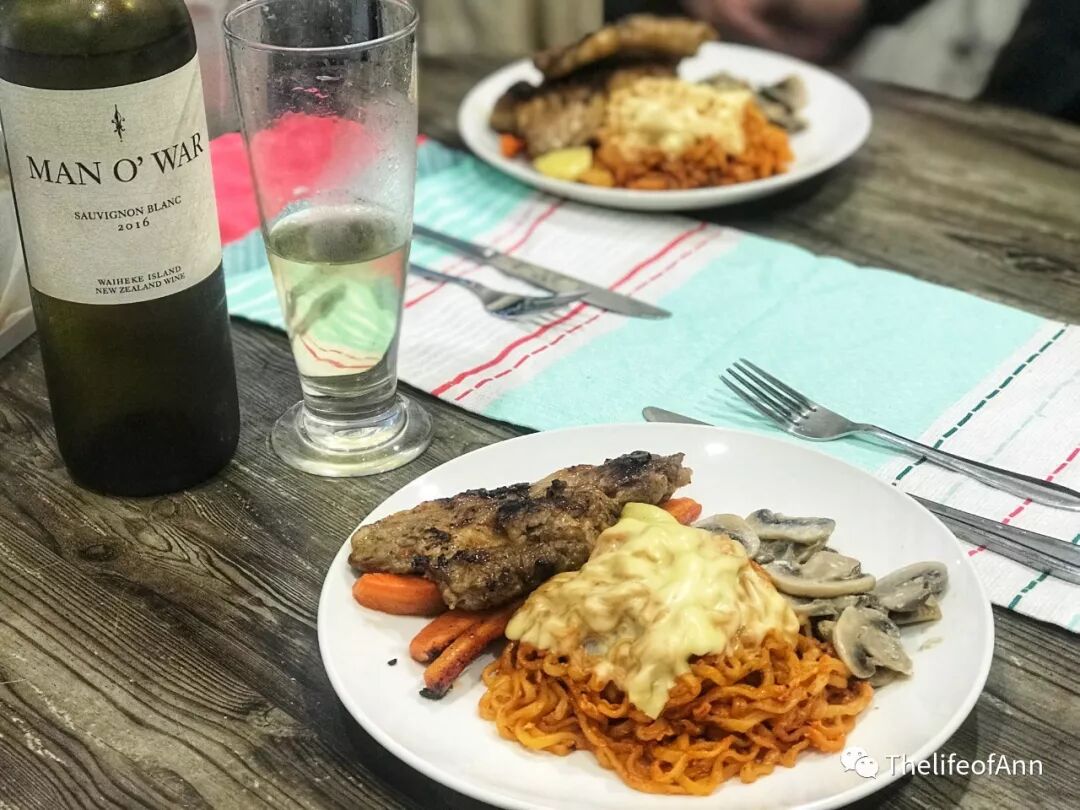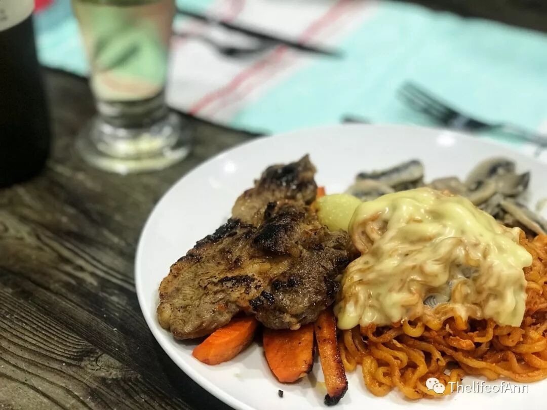 大块的牛排、羊排向来是西餐的经典主菜。说真的,第一次吃的时候没觉得多好吃。吃的次数多了才品味出它不同于中餐的独特口感。一般来讲,牛排可以有三分熟、五分熟、七分熟,但羊排只能是全熟。我在做法上采用了西式的,但在调味上选择了孜然。由于刚回来,家里食材严重短缺。便用泡面做成炒面当作主食,加入了些许配菜。搭配原产地新西兰的白葡萄酒,解腻的同时又添了几分西餐厅的高级感。