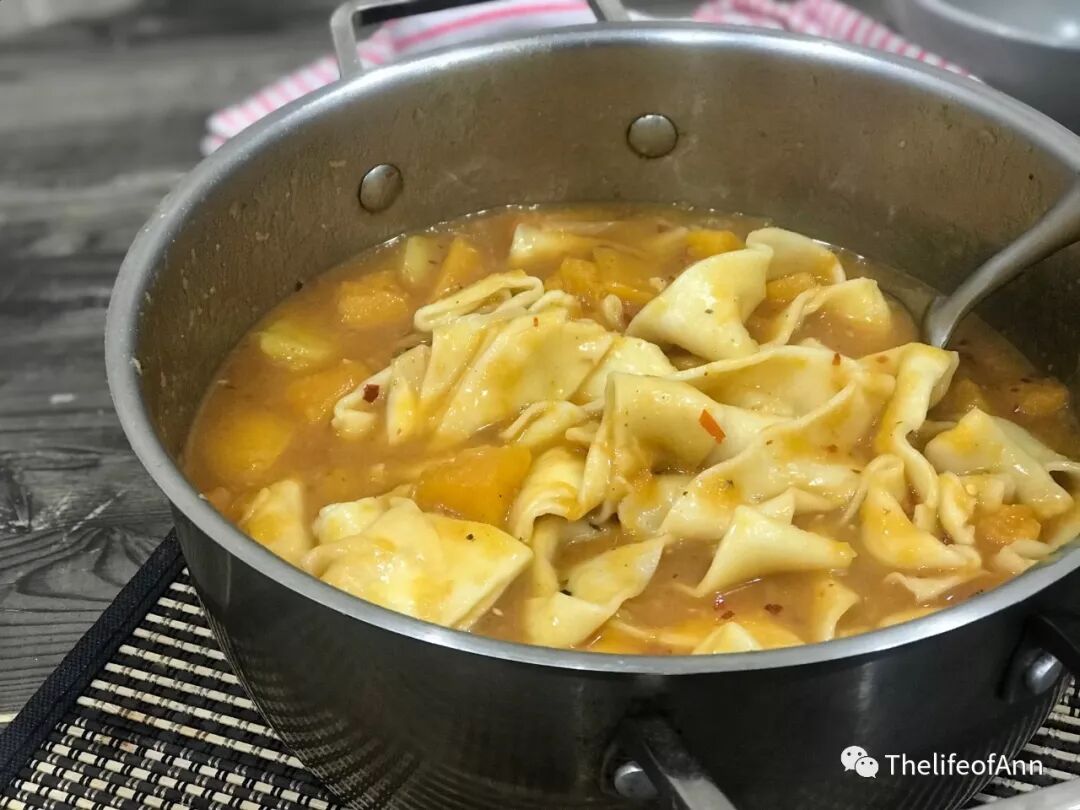 南瓜一直是我奶奶很爱的食材。受她老人家的影响,如今也成了我家的常备食材之一。我最爱的吃法是南瓜包子,无奈南瓜切丁太耗时,只好退而求其次做了南瓜面。在家时,奶奶总会把面切成菱形的面片,但某人更喜欢吃面条,于是我做了些改良。这样一锅看似其貌不扬的南瓜面,吃起来却让人根本停不下来。面条的劲道碰上南瓜土豆的软糯,再来点自制辣椒油。那滋味叫人忍不住的再来一碗。