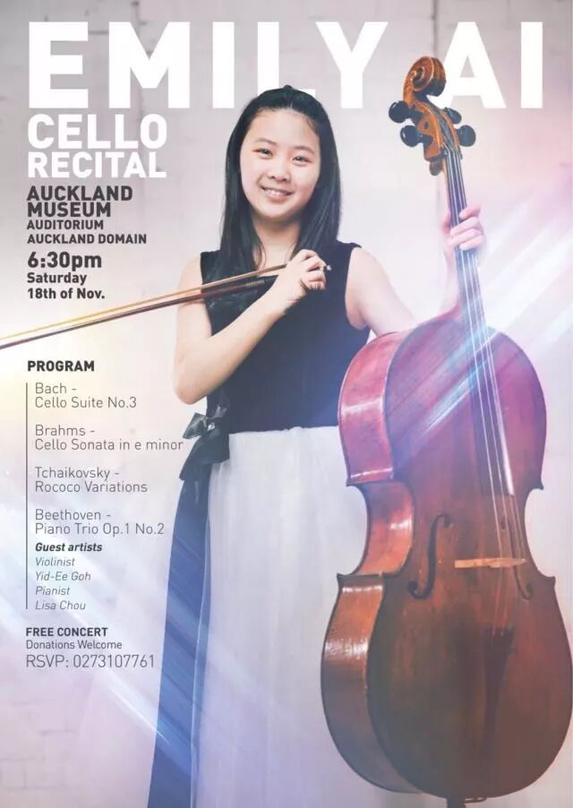 Emily艾美美的大提琴独奏慈善音乐会将于11月18号周六晚6:30,在Auckland Museum(奥克兰博物馆)Auditorium 音乐厅举行,这名古灵精怪的大提琴女孩,将用大提琴叩响巴赫、勃拉姆斯、柴可夫斯基和贝多芬的经典经典大提琴独奏曲,为你献上2017年底难以忘怀的音乐幻梦。